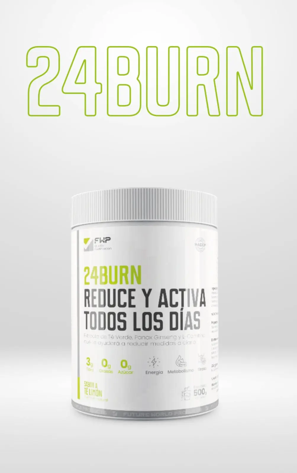 24 Burn – El acelerador que tu metabolismo necesita 24 Burn es la mezcla perfecta de té verde (95% polifenoles), Panax Ginseng, Guaraná y L-Carnitina diseñada para activar tu cuerpo y mente, ayudándote a quemar grasa, controlar el apetito y aumentar tu energía durante todo el día.